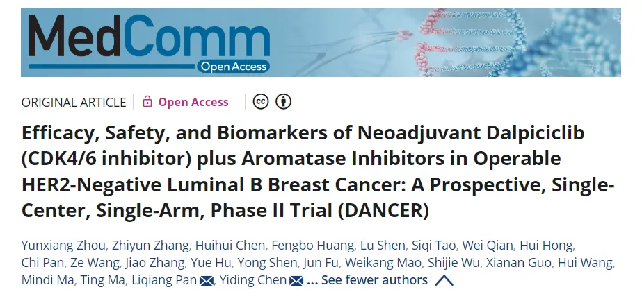 2025年10月11日,《MedComm》(IF=10.7, 中科院/ JCR双一区)在线发表了浙江大学医学院附属第二医院陈益定/潘利强/周云翔教授团队的“DANCER”研究报告,数据表明CDK4/6抑制剂达尔西利联合芳香化酶抑制剂的新辅助治疗方案,在HER2阴性Luminal B型乳腺癌中具有显著的抗肿瘤活性[2周完全细胞周期阻滞(CCCA)率达86.7%]和可控的安全性。通过系列样本采集和多组学分析,研究成功识别了潜在的疗效预测生物标志物,并据此提出了一个全新的“二阶预测框架”。