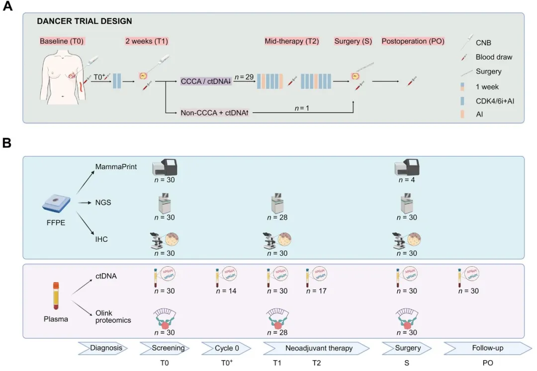 多组学分析:在基线(T0)、Cycle 0结束后(T0+,仅绝经前患者)、T1、治疗中期(T2)、手术时(S)及术后(PO)多个时间点采集血浆样本,用于ctDNA分析与Olink蛋白质组学检测。同时,在T0、T1和S时间点获取肿瘤组织样本,进行体细胞突变谱分析、免疫组织化学分析及 MammaPrint检测(图1B)。