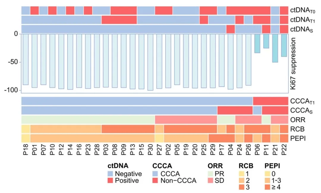 达尔西利联合内分泌治疗2周后,患者Ki67水平较基线显著降低,并且86.7%(95% CI,69.3%-96.2%;n=26)的患者达到CCCA,其中4例CCCAT1患者在手术出现Ki67反弹,而另有1例Non-CCCA T1患者呈现延迟的CCCAS反应。术前磁共振评估的总缓解率达60%(18/30),根据术后病理报告,RCB 0-1级的患者比率为3.3%(95% CI,0.1%–17.2%;n=1),乳房病理完全缓解(bpCR)和术前内分泌预后指数(PEPI)0分的患者比例均为6.7%(95% CI,0.8%–22.1%;n=2),没有患者达到总病理完全缓解(tpCR)。