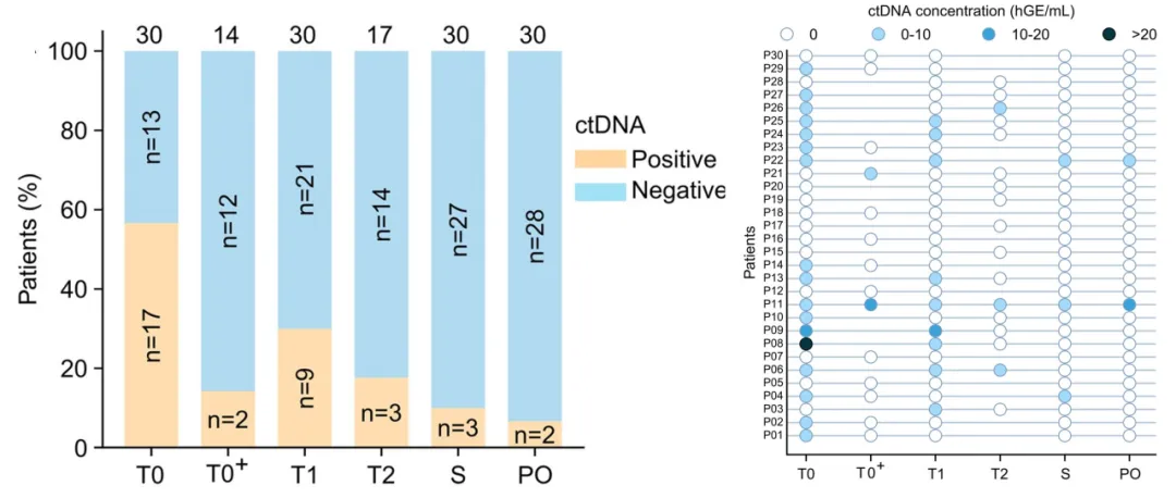 (左)基于每个时间点的可用样本数量,ctDNA呈阳性的患者比例;(右)新辅助治疗期间所有30名患者的个体ctDNA轨迹