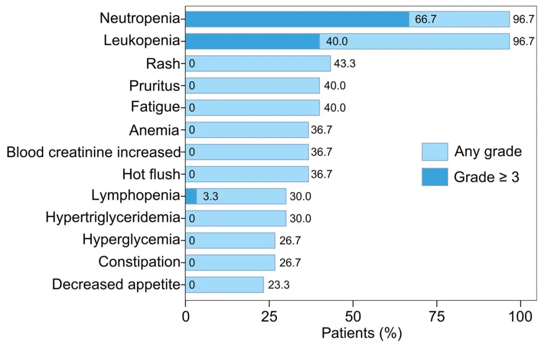 所有患者均经历了至少两次治疗期间出现的不良事件(TEAEs),且大多数为1级。最常见的不良事件为血液学毒性和皮疹。20例(66.7%)患者发生了≥3级不良事件,经对症治疗后均未产生临床后果。其中最常见的是中性粒细胞减少(3级:16例,53.3%;4级:4例,13.3%),其次是白细胞减少(3级:11例,36.7%;4级:1例,3.3%)、淋巴细胞减少(3级:1例,3.3%)和口腔炎(3级:1例,3.3%)。未出现任何临床后遗症,也未记录到发热性中性粒细胞减少或5级不良事件。