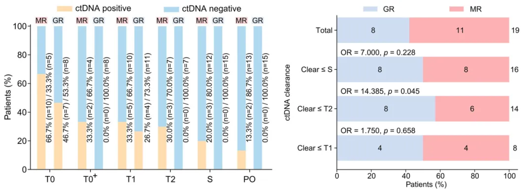 GRs在多个时间节点(T0+,T2,S,PO)表现出ctDNA阴性。进一步分析ctDNA阳性的患者数据表明,与T2前就即完成ctDNA清除的患者相比,在T2和/或S时仍保持ctDNA阳性的患者,MR比例显著更高(100.0%[5/5] vs. 42.8%[6/14];p=0.045)。
