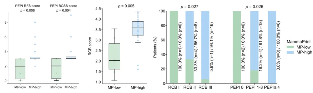 与低风险患者相比,MammaPrint高风险患者表现出更高的PEPI(左)和RCB(中)评分;按RCB分级和PEPI风险分组的MammaPrint高风险比例(右)