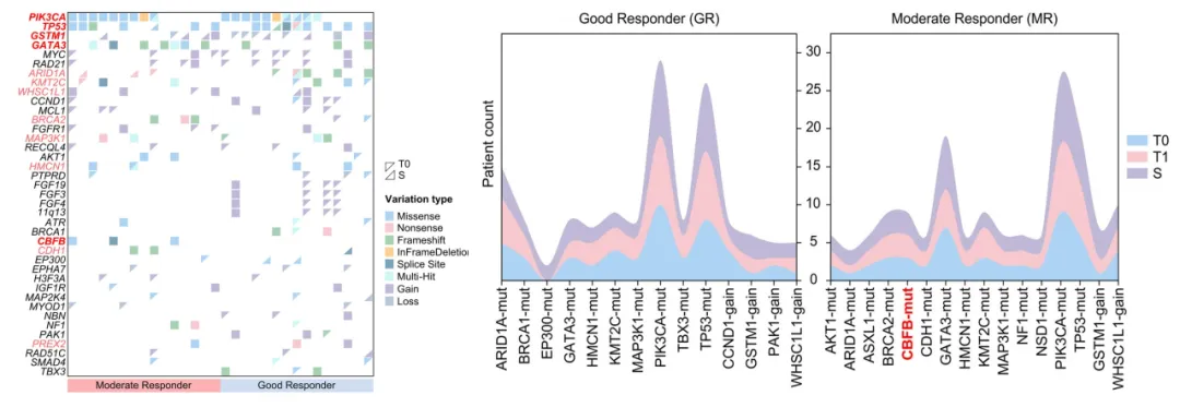 (左)GRs和MRs在T0与S的高频突变基因(≥10%)图谱;(右)GRs与MRs在T0、T1及S时的基因变异时序变化,展示S时变异频率≥13.3%(2/15)的基因