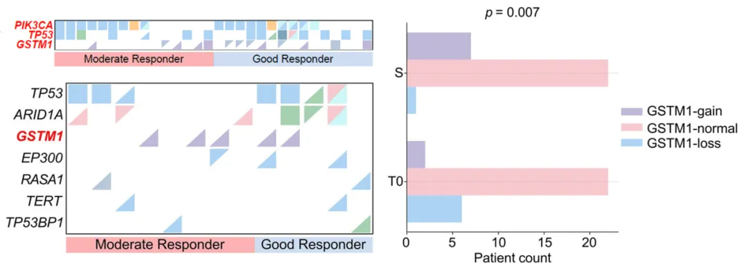 此外,研究还发现GSTM1基因的拷贝数状态与患者对达尔西利新辅助治疗的应答显著相关。基线分析显示,尽管未达统计学显著性,但GSTM1基因缺失在GRs中呈现更高频率。更具启示性的是,在手术样本中观察到GSTM1拷贝数模式的显著动态演变:在基线时存在GSTM1缺失的6例患者中,5例患者该缺失在治疗后(S)已无法检出;与此同时,另有5例患者治疗后出现了新发的GSTM1基因扩增。这一显著的基因组动态变化(p=0.007)提示,达尔西利治疗可能对携带特定GSTM1基因背景的肿瘤细胞群体施加了选择性进化压力,从而驱动了克隆构型的适应性改变。