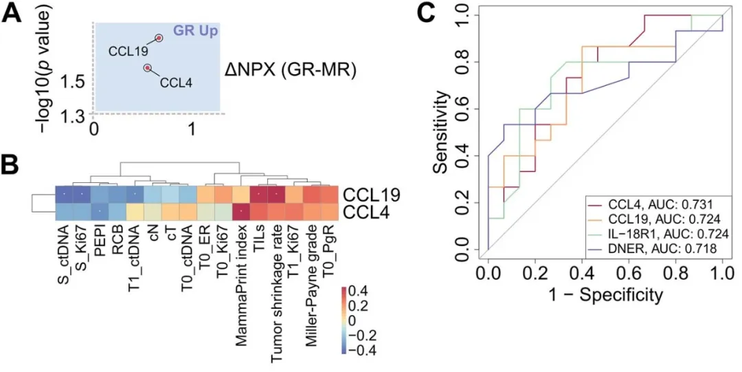 (A)简化火山图展示T0时GRs与MRs间存在显著差异的血浆蛋白;(B)热图显示差异蛋白与临床病理参数间的Spearman相关性分析结果;(C)基于基线血浆蛋白预测GR的ROC曲线,展示p值<0.05的四种蛋白