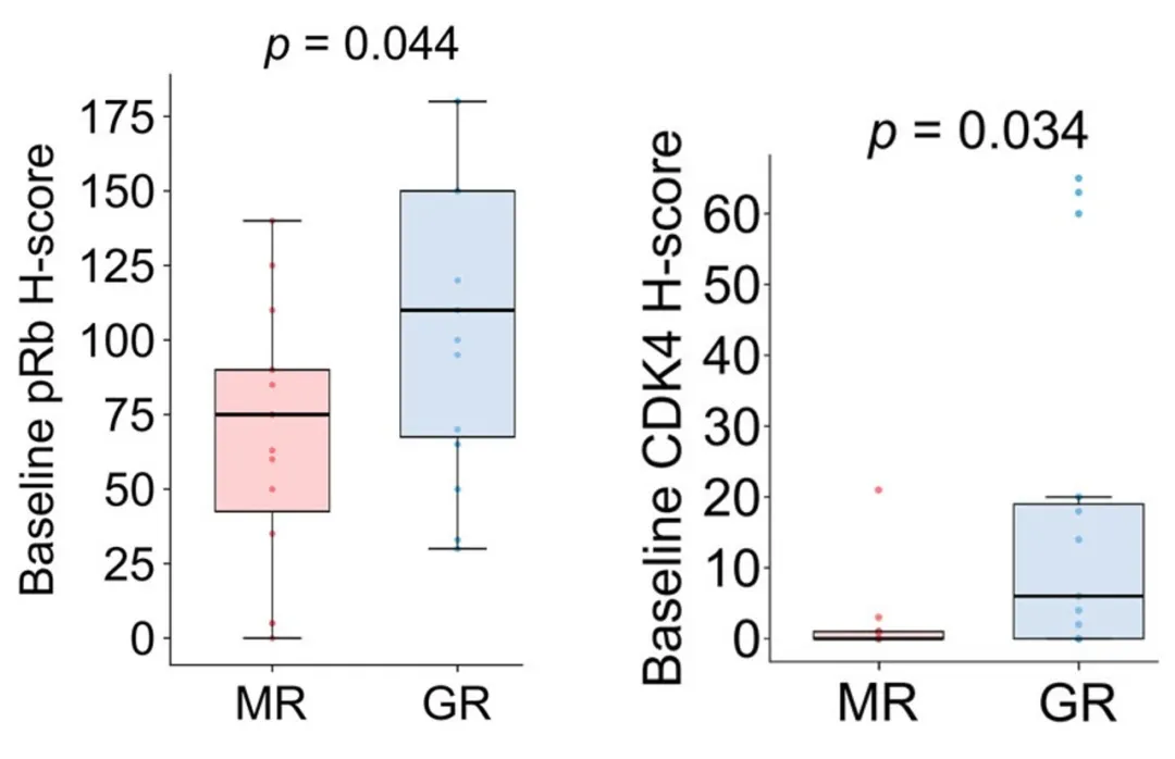 与MRs相比,GRs的pRb(左)和CDK4(右)的基线H-score更高