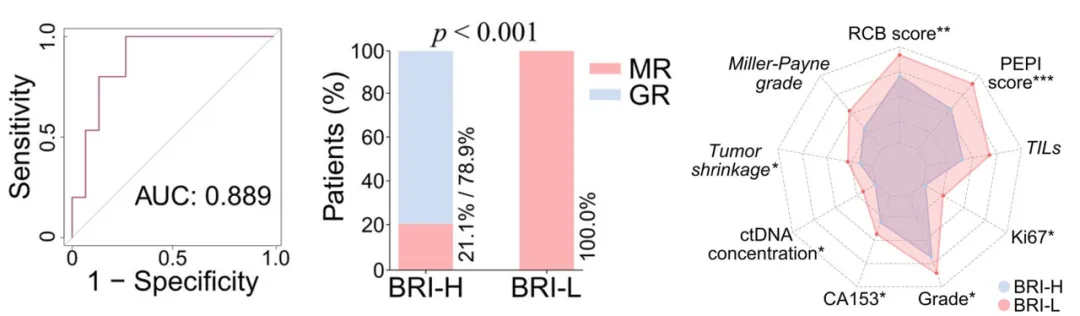 (左)基于BRI预测GR的ROC曲线;(中)按高(n=19)和低(n=11)BRI分层的患者治疗反应;(右)雷达图比较BRI高(BRI-H,n=19)和BRI低 (BRI-L,n=11)患者的手术疗效和预后参数