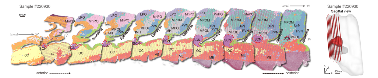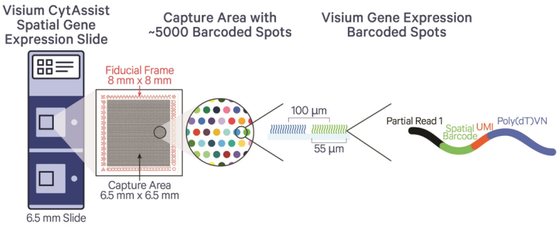 10x Visium Cytassist空间转录组芯片采用点阵式阵列设计,由均匀排布的圆形捕获位点(spot)构成,单个spot直径为55μm,相邻spot中心间距为100μm【分辨率:100μm】;每个spot内部集成了针对目标物种的特异性寡核苷酸探针库,探针通过序列设计与样本中RNA分子精准互补结合,实现对不同基因转录本的特异性捕获