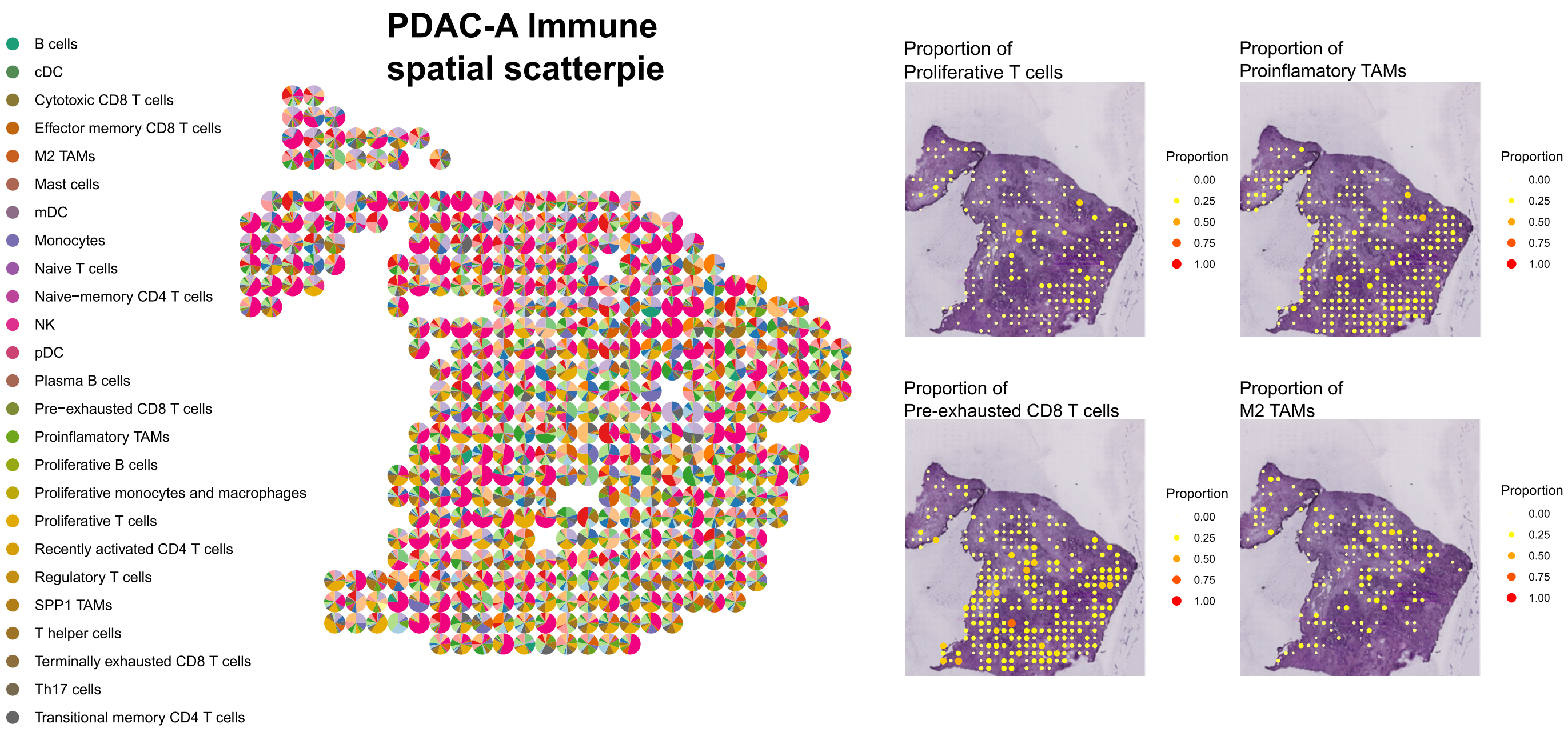注:通过单细胞数据作为参考,解析空间转录组数据中每个spot的细胞类型组成(小鼠大脑),并根据细胞组成划分肿瘤区与非肿瘤区。