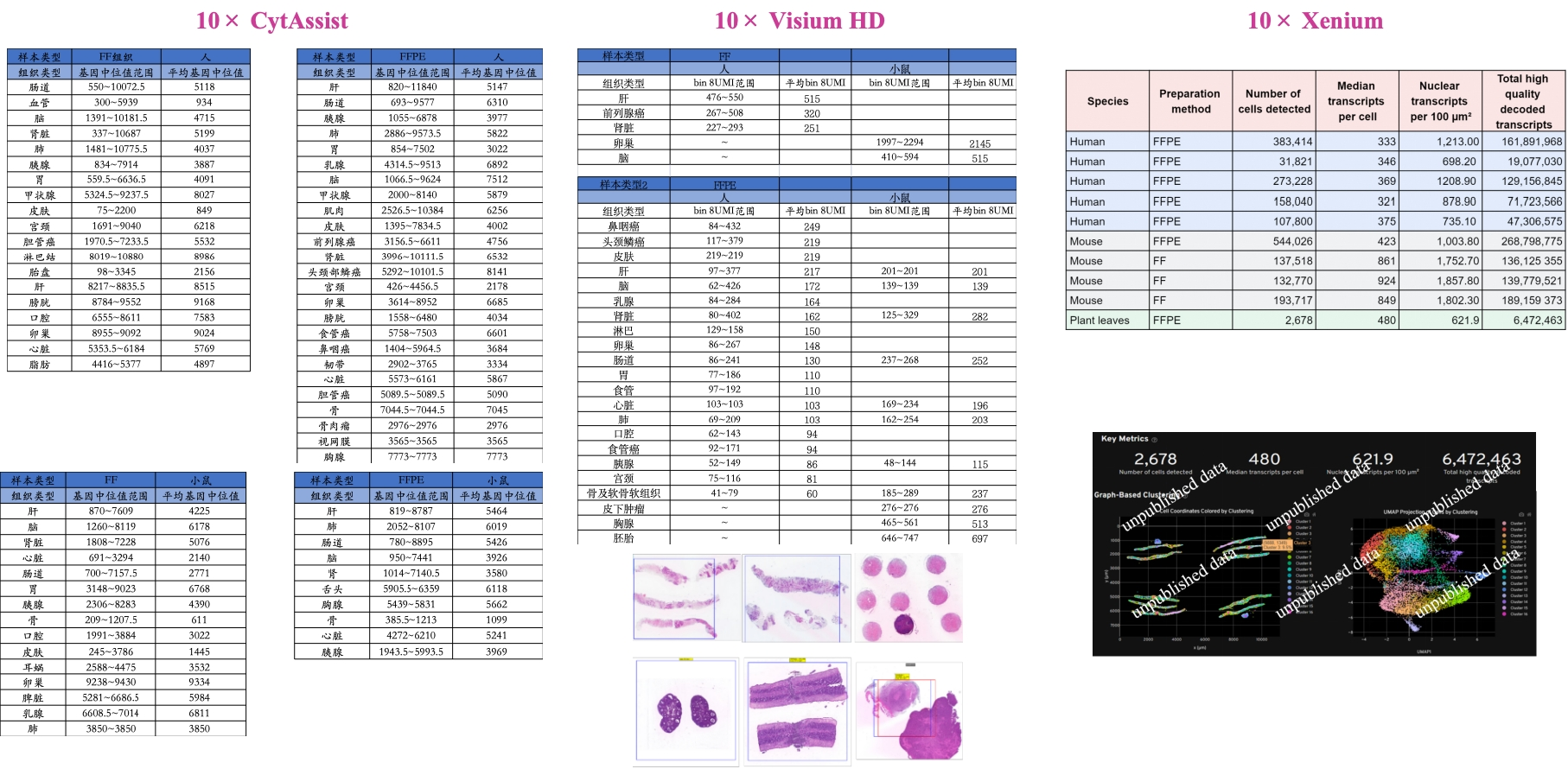 覆盖石蜡切片、冰冻组织、穿刺样本等多种样本类型,涵盖肿瘤、神经、免疫、自身免疫病等主流研究场景。从样本前处理、切片质控、探针杂交到空转检测与数据分析,全流程形成标准化、可重复的实验体系,有效保障数据稳定性与检出率,大幅降低批次差异与实验失败风险。依托成熟的技术平台与丰富的项目经验,可高效支撑从基础探索到大队列临床转化研究,为高质量空间多组学成果提供坚实的实验保障。