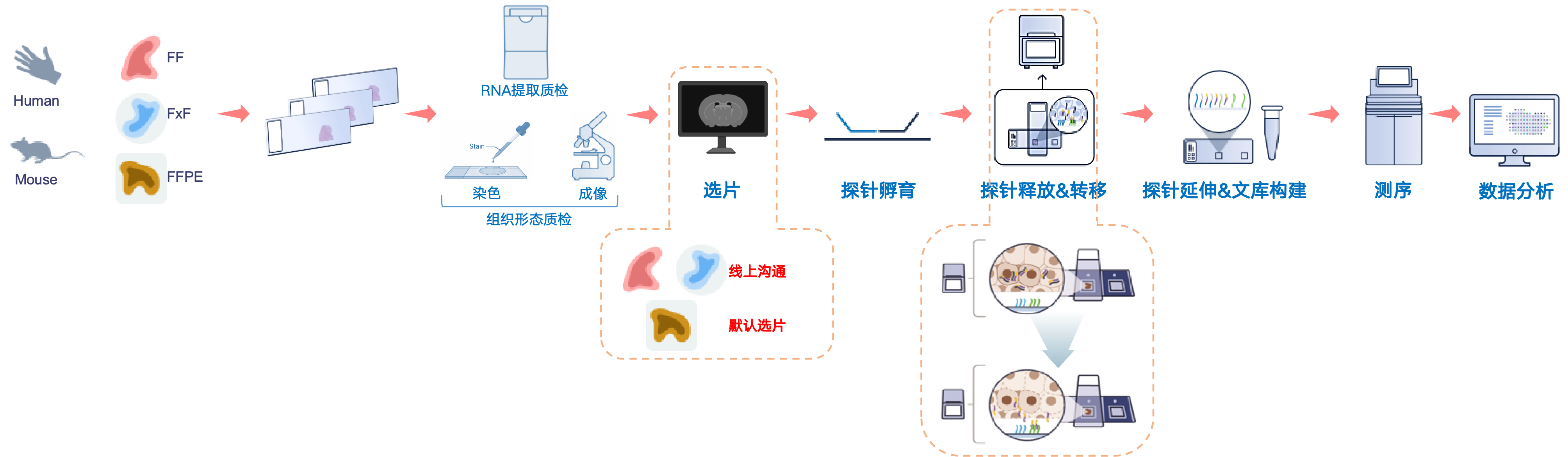 新鲜冷冻组织为例:样本经OCT包埋后,切10μm切片置于Visium玻片,H&E染色获取形态图;透化释放mRNA,与探针结合并原位反转录生成带空间条形码和UMI的cDNA;洗脱cDNA构建测序文库;测序分析后将表达数据映射到组织图像,得到空间转录组图谱。