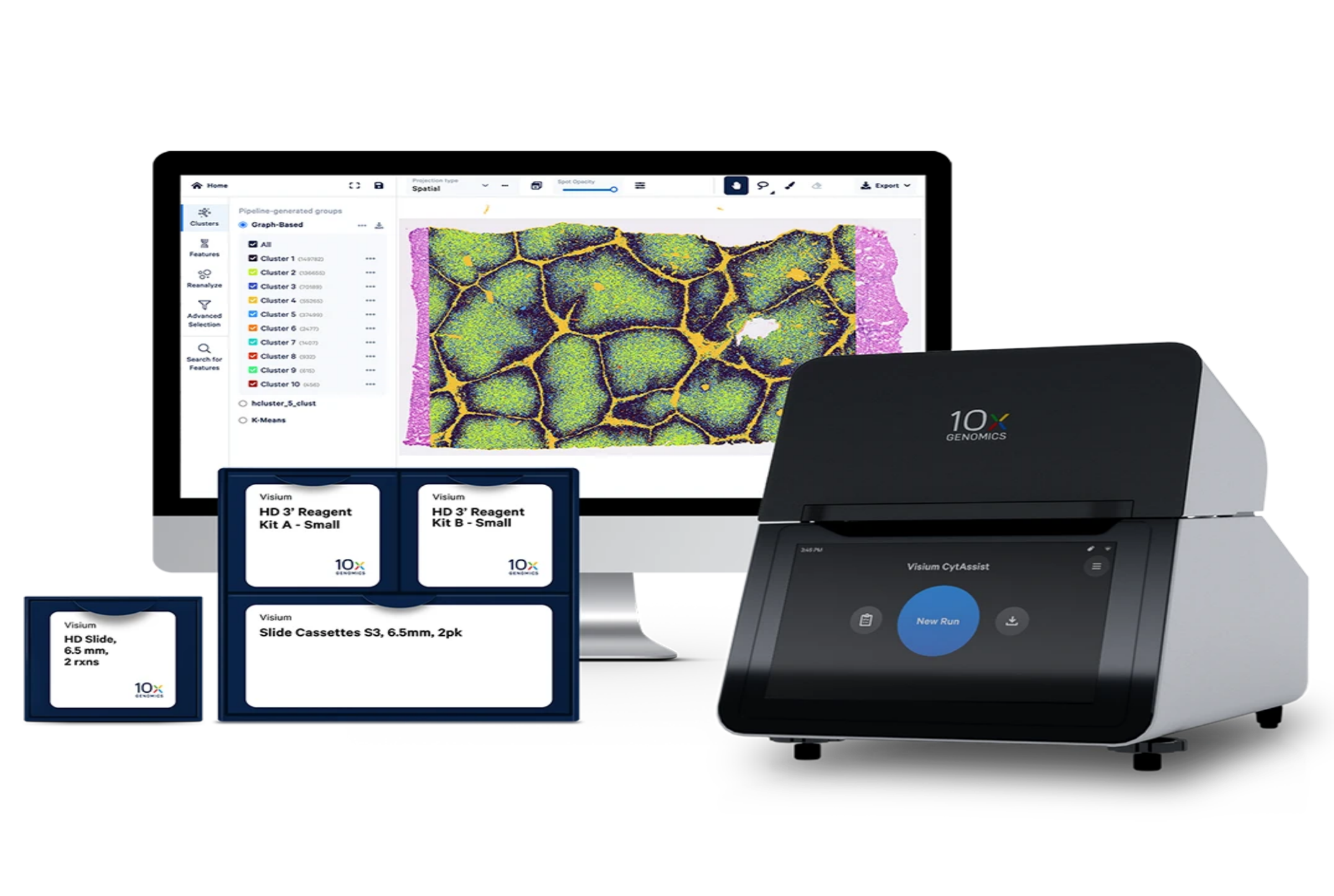 10x Visium HD3'延续了自动化探针转移技术,将标准载玻片上FFPE、冰冻包埋等多类组织切片的转录组信息精准捕获至Visium捕获玻片,支持先染色选优质切片再分析,全流程自动化集成使结果稳定可靠,大幅拓展了空间转录组研究的样本范围与应用场景。