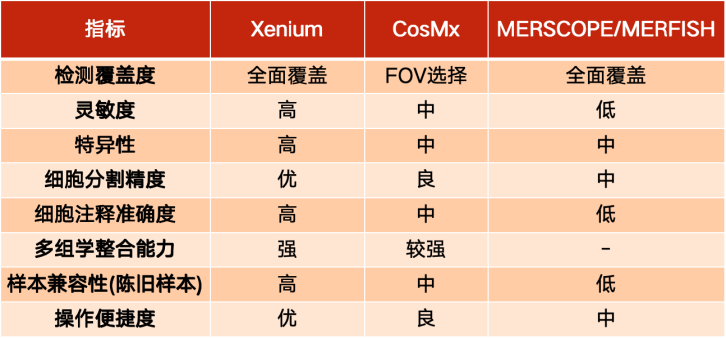 根据最新发表的四篇高质量文章梳理和总结了Xenium、CosMx与MERFISH/MERSCOPE,目前市面上最主流的三大高分辨率空间转录组平台的性能差异,发现10x Xenium在技术参数、数据质量、临床适用性等方面都有着一定优势,是全面的“六边形战士”。