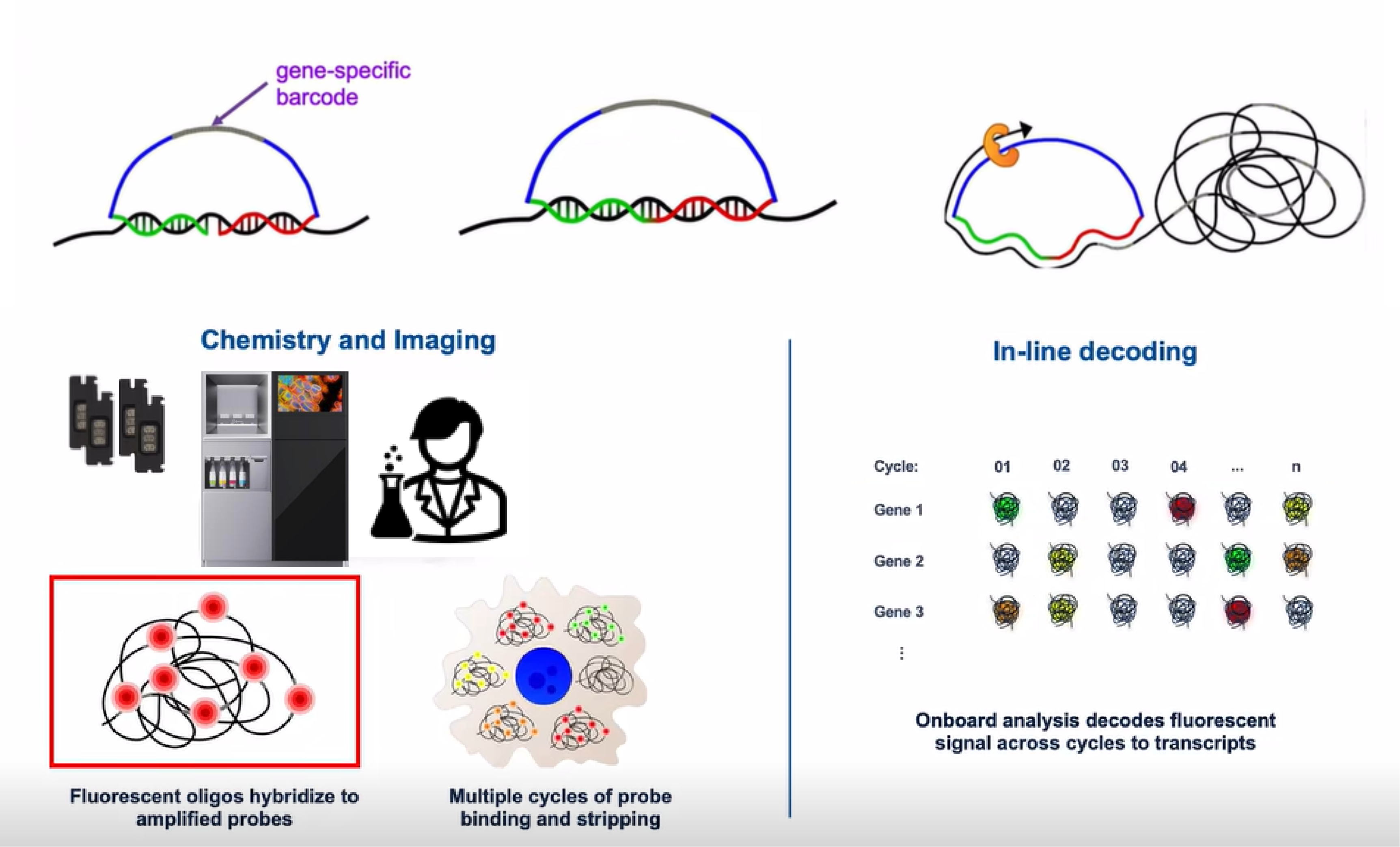 10x Atera是基于挂锁式探针(Padlock Probe)+滚环扩增(RCA)+多轮荧光成像解码的原位空间转录组技术。核心是用双端基因特异性挂锁探针识别靶RNA,仅两端完全匹配才连接成环并经RCA放大信号;再通过多轮“荧光探针杂交–成像–淬灭”,为每个RNA分子赋予独特荧光条形码,最终解码得到单分子级、高分辨率的基因空间定位。