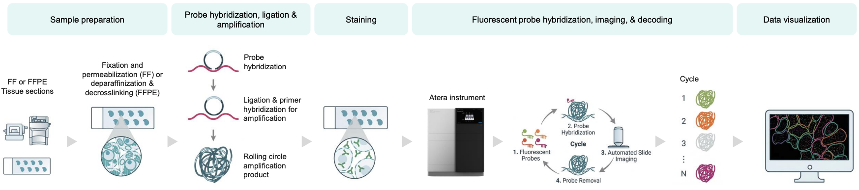 将组织切片放置在Xenium载玻片上,铺上特异性DNA探针,探针在组织表面直接杂交结合mRNA分子。然后进行进行滚环扩增(RCA),扩大探针信号;通过对切片进行多模态染色,对每个细胞的边界进行区分;最后,将Atera玻片放置到Atera In Situ Platform原位分析仪中进行荧光探针杂交、循环成像、解码和数据分析,从而在切片原位获得目标基因的转录组图谱。