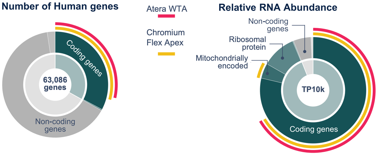 10x Atera在10x Xenium基础上实现了原位空间转录组的全转录本覆盖,总共涵盖了18000+蛋白编码基因,真正实现人类蛋白编码基因全景式原位检测,完整保留样本中全部转录本信息,大幅降低关键基因遗漏风险,尤其适用于未知机制探索、新发疾病研究、肿瘤异质性全景分析等场景。