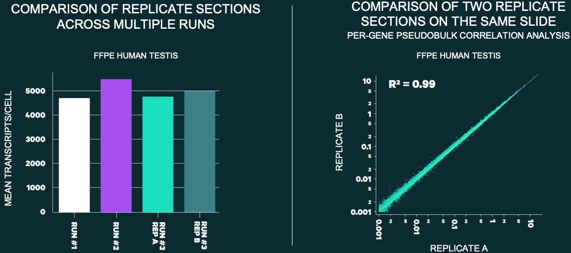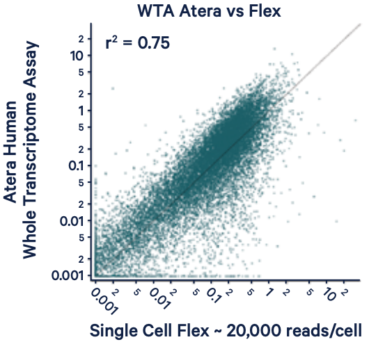 10x Atera数据稳定性高,同样本多重复取样检出持续保持在较高水平且一致性强。此外,10x Atera与10x Single Cell Flex单细胞转录组数据表现出良好的一致性(R2=0.75),保证了单细胞+空间转录组联合分析的稳健性。不管是单次样本实验还是大队列研究,10x Atera既保证了数据的稳定可重复,又能满足研究目的的细致挖掘需求。