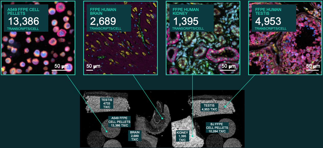 10x Atera与10x Xenium相同,支持新鲜冷冻(FF)和石蜡包埋(FFPE)组织切片样本,通过多模态染色定义细胞边界,通过多轮荧光成像与解码完成转录本的空间定量、定位实现转录本的高灵敏度检测和高分辨率空间数据获取,充分保障基因表达信号的原位精准捕获。