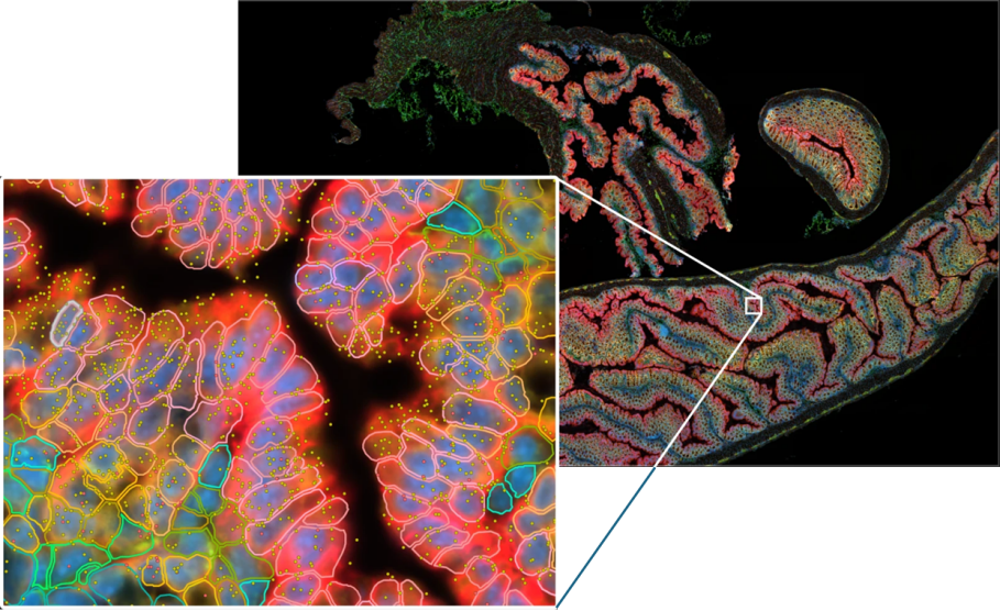 通过结合高分辨率显微成像、原位探针杂交与荧光解码技术,从完整的组织切片中精准捕获每个细胞的转录组数据,并将组织形态学特征与基因表达谱深度结合,通过原位数据分析流程实现基因表达与组织形态学数据的精准空间可视化。该技术可直接在单细胞分辨率下完成全转录本的原位空间分析,实现组织切片的无间隙全区域覆盖,无需转录本转移步骤,直接在组织切片上完成探针杂交、链接与滚环扩增等原位反应。